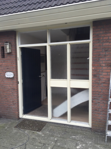 De wens van deze particuliere klant was om de entree van de woning aan te passen door de 4 kleinere ruiten te vervangen voor 2 grotere. Om dit te bewerkstelligen was er naast het plaatsen van deze ruiten, ook een aanpassing aan de kozijnen benodigd. Na het aanpassen hiervan zijn de 2 grotere matte ruiten geplaatst en een tevreden klant als eindresultaat! Bekijk hieronder de voor- en na foto’s van de entree van de woning.